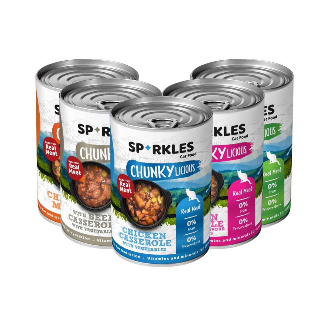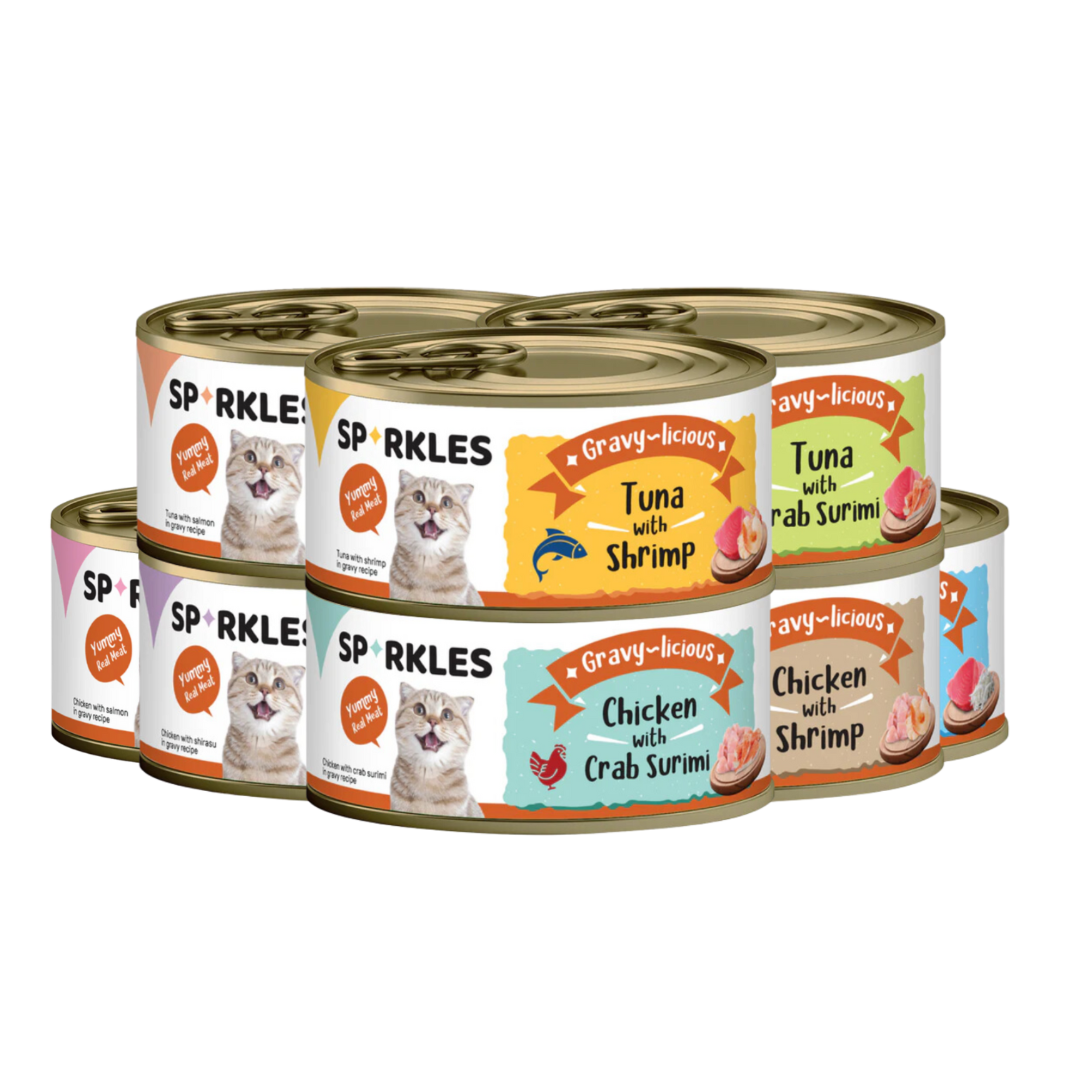 تأتي منتجات القطط من سباركلز بنكهات متعددة مثل الدجاج مع الشيراسو والتونة مع السلمون والدجاج مع الروبيان والإسقمري مع الجزر، أما سباركل بت تريتس فتقدّم وجبات بنكهات متنوعة من لحوم البقر والدجاج والسلمون والأسماك البرية.